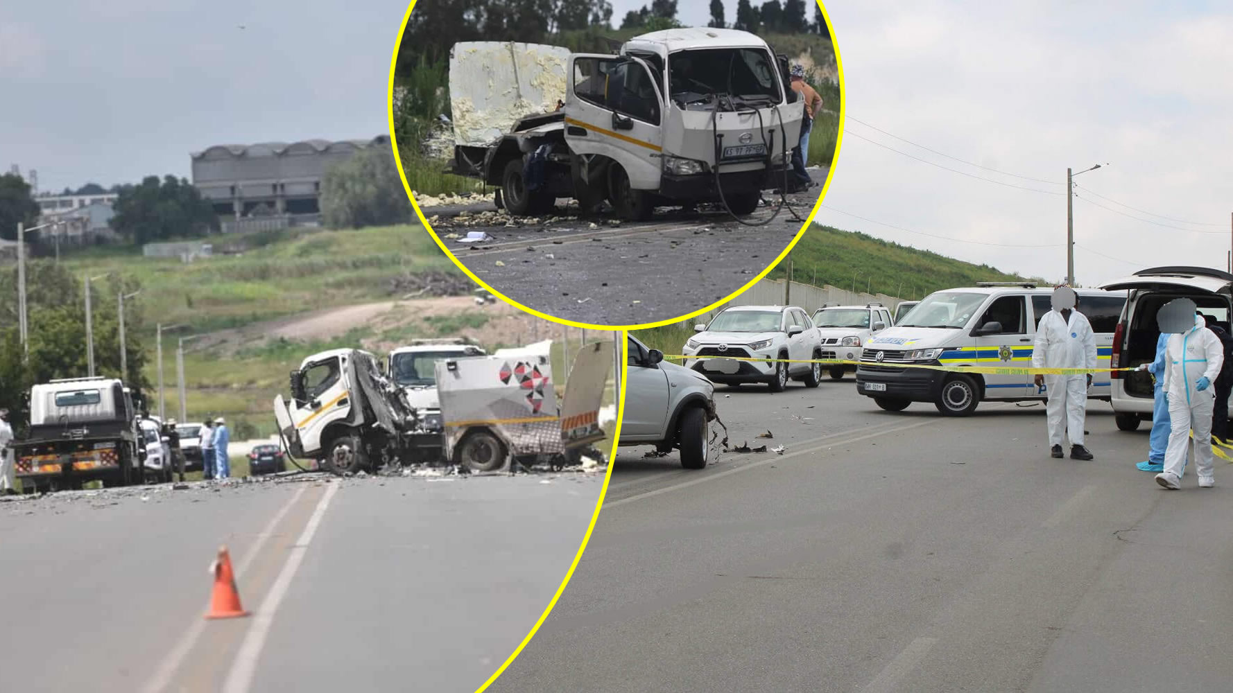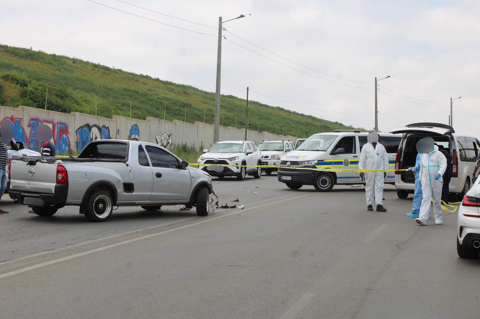Roodepoort Record journalists arriving at the scene were instructed to remain inside their vehicles and were cautioned against taking photographs, as the crime scene had not yet been cleared by forensic teams. A damaged Opel Corsa bakkie was visible in the middle of the road, surrounded by several police vehicles, while journalists and members of the public were kept away from the immediate area.