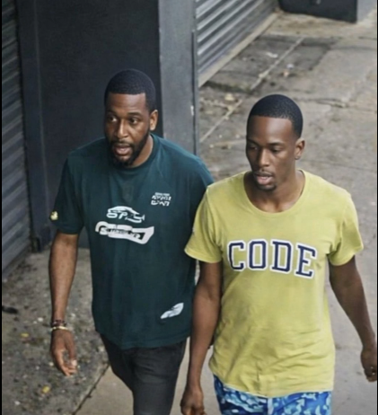 On his left, walking alongside him, is an unidentified man in a white T-shirt. The pair move out of the camera’s view in the direction of Fox Street.